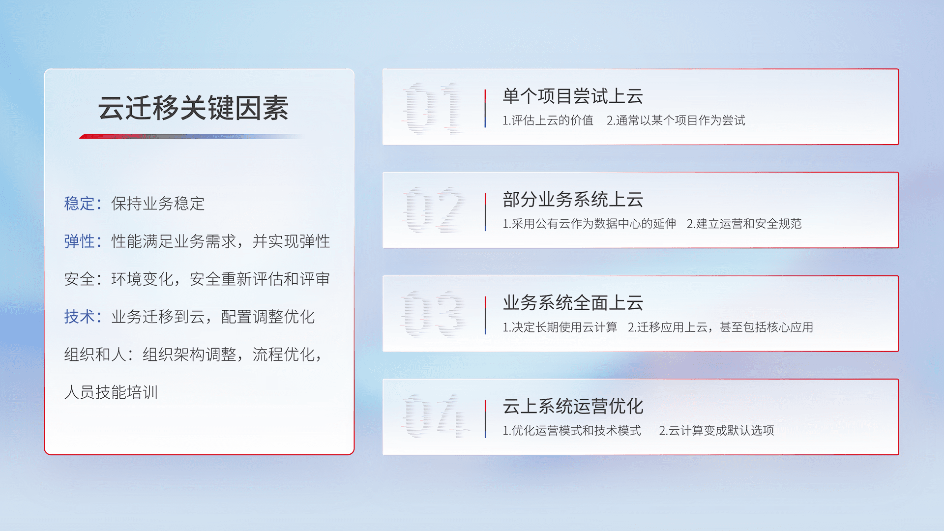 结合实际业务,,,从规划设计、、云平台选型、、、云原生改造、、数据迁移、、、集成交付,,迁移全过程为客户识别最佳上云路径,,,做好风险识别管理,,设计网络架构、、、身份权限、、、安全审计合规、、操作审计、、日志审计、、监控告警策略、、多站点容灾设计等,,对云上基础设施进行整体规划,,,提升IT治理水平,,以满足弹性、、高可用、、高性能的需求。。