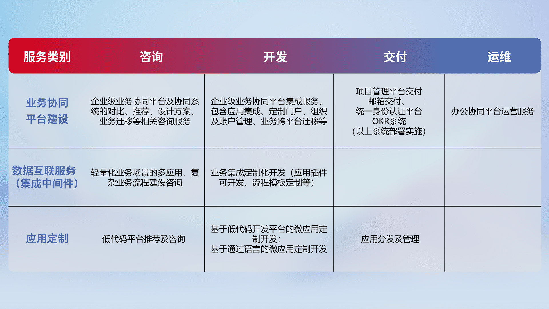 针对钉钉、、企微、、、、IDaas等平台级产品提供产品的规划、、方案、、交付、、、、定制化开发等服务,,实现如统一协同办公、、、、智能客户服务、、、、混合会议管理、、智能数据查询、、、等业务场景,,实现数字化转型。。。。